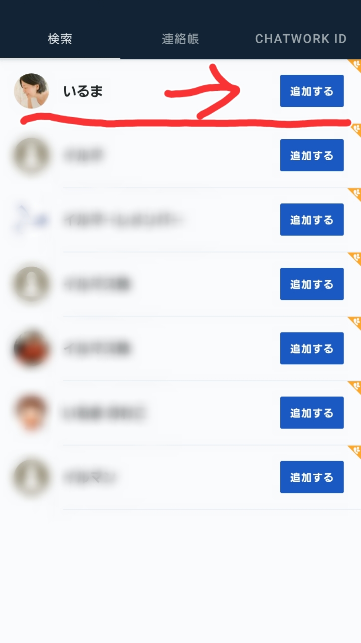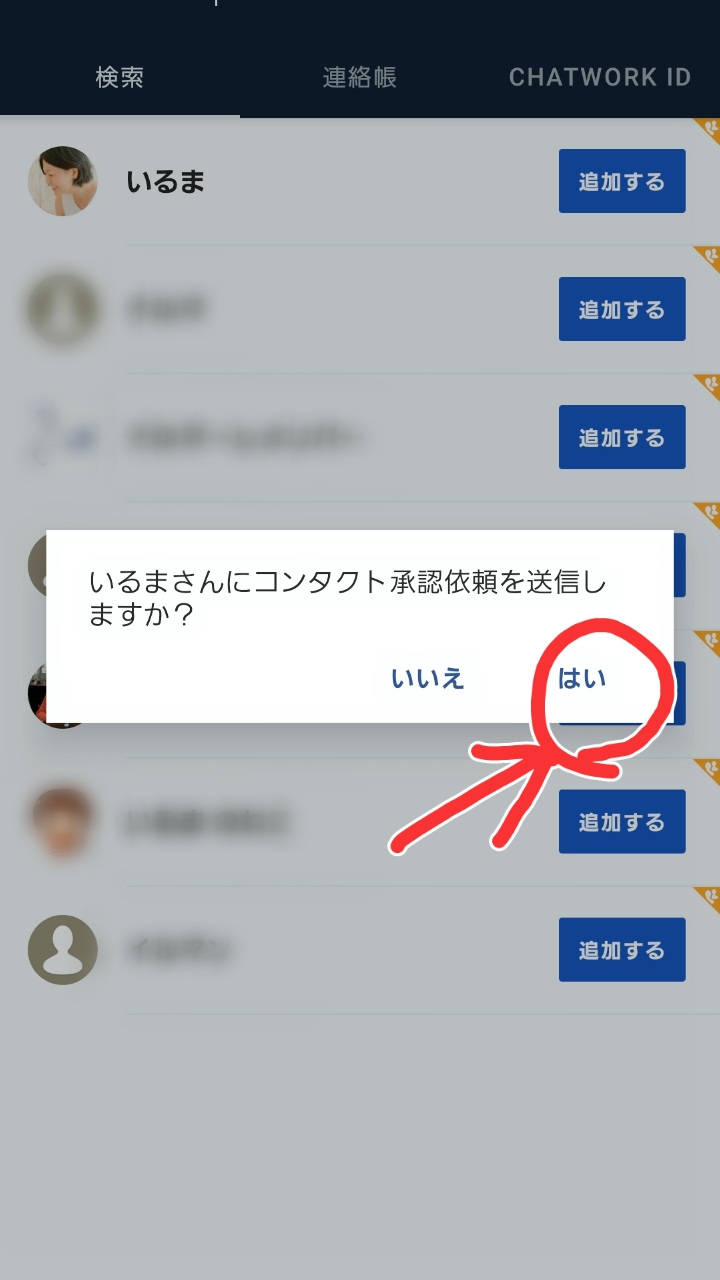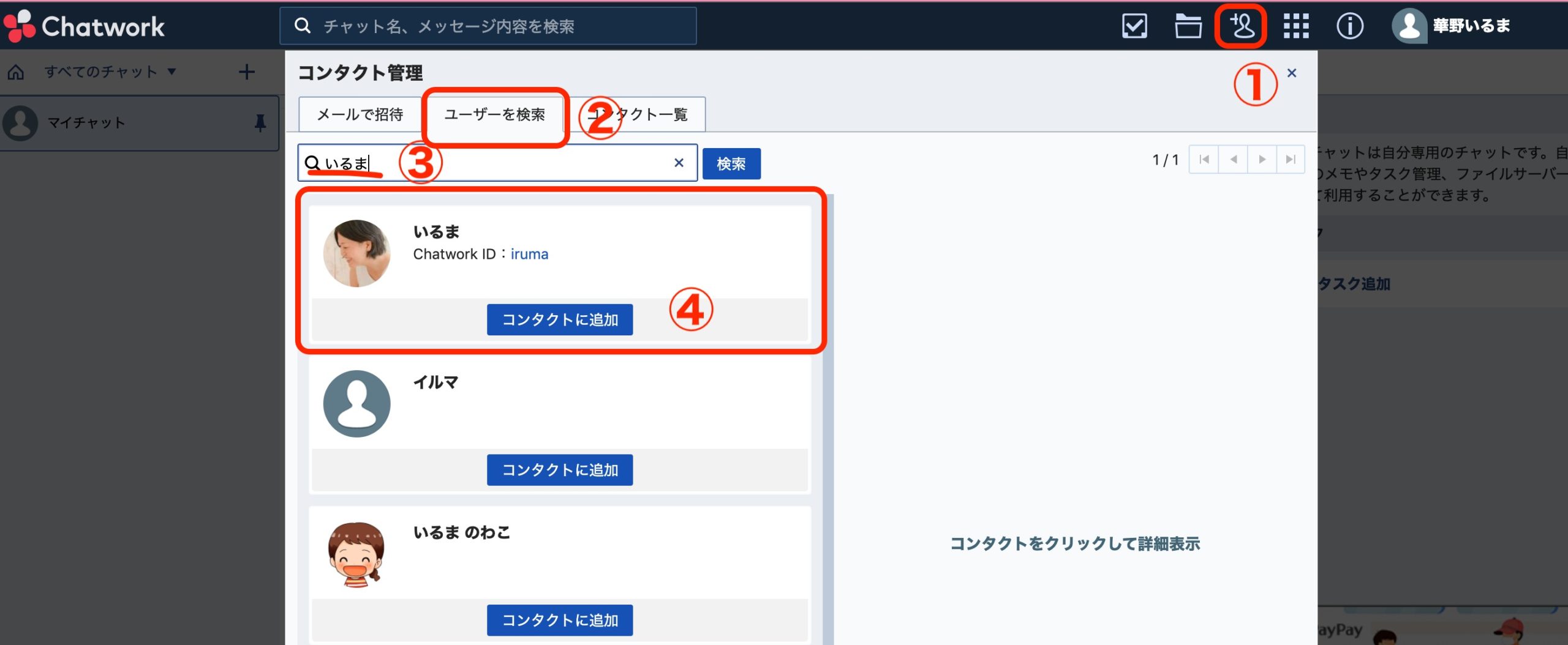 チャットワークの登録が終わりましたら「いるま」をコンタクト申請してください。